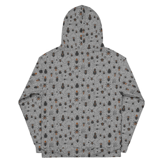 Unisex Hoodie for Arachnology lovers. Black and funny spiders collection on dark grey
