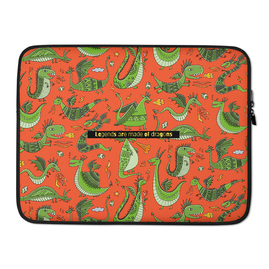 Personalised Laptop Sleeve with funny green Dragons on red. Basic text - Legends are made of Dragons