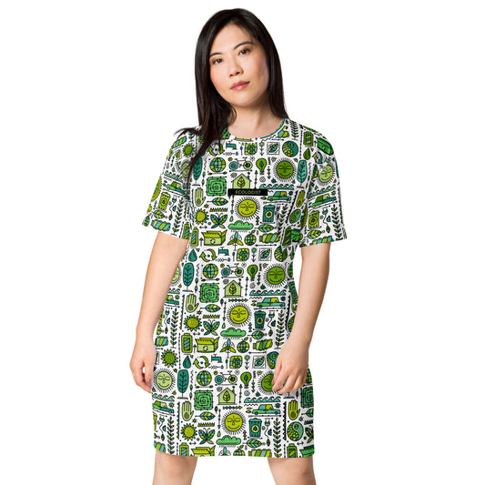 T-shirt dress white with green ecology symbols. Personalised text - Ecologist