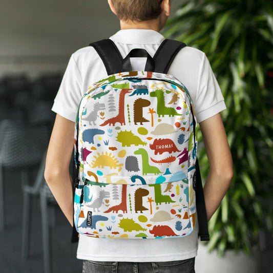 Mochila de paleontología con estampado de dinosaurios a todo color. Nombre personalizado.
