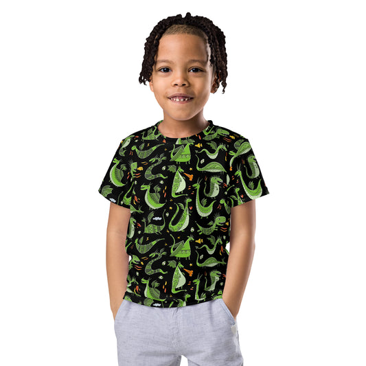 Детская футболка с круглым вырезом и зеленой коллекцией велосипедов на сером фоне с персонализированным текстом (базовый текст - Cyclogist)